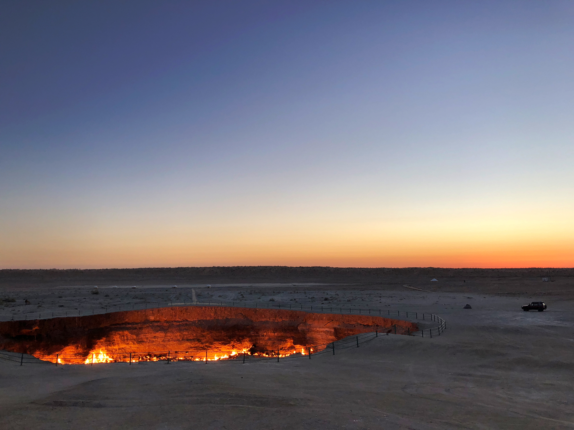 Das am schwierigsten zu erreichende, aber mit Sicherheit beeindruckendste Reiseziel ist das sogenannte „Tor zur Hölle“ im zentralen Turkmenistan. Das Loch in der Erde entstand 1971 auf der Suche nach Gasvorkommen und steht seither in Flammen. Um den Krater von Derweza besuchen zu können, gilt es zuerst eine nervige Fülle von bürokratischen Auflagen zu erfüllen, damit man überhaupt nach Turkmenistan einreisen kann.