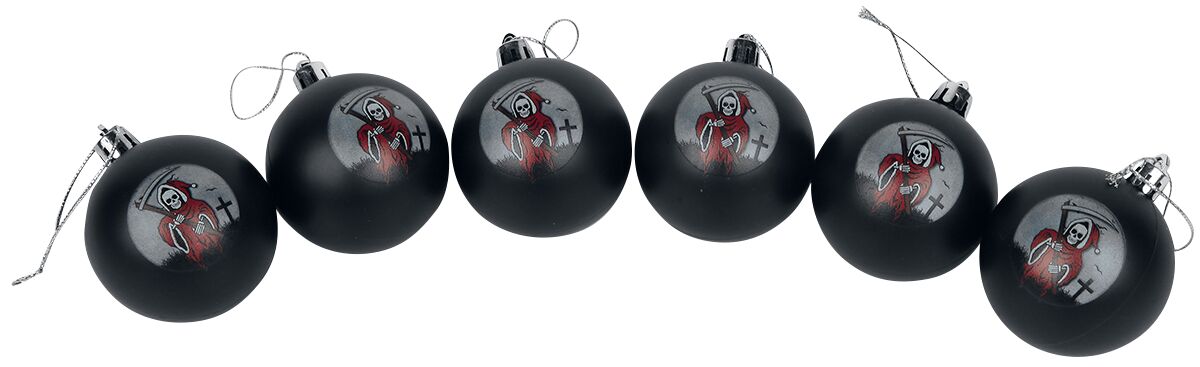Auch wenn es weihnachtsbaumbefreite Zonen geben soll, beugt sioch doch die Mehrheit der (Metal-)Haushalte der Tradition und stellt sich eine arme kleine abgehackte Konifere in den Wohnbereich und behängt sie mit allerlei Unrat. Dabei sollte doch wirklich noch Platz sein für dieses nette 6er-Set, bedruckt mit einem Sensenmann…?