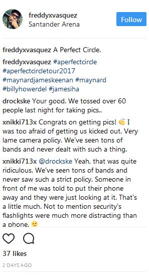 Prompt meldete sich „Drockske“ aka David Farrar, der Geschäftsführer der Santander Arena, und schrieb, dass über 60 Personen rausgeschmissen wurden, weil sie Fotos gemacht haben. Es sei eine sowieso nicht neue Vorgabe von Maynard James Keenan und gelte für dessen Bands Tool, A Perfect Circle und Puscifer.