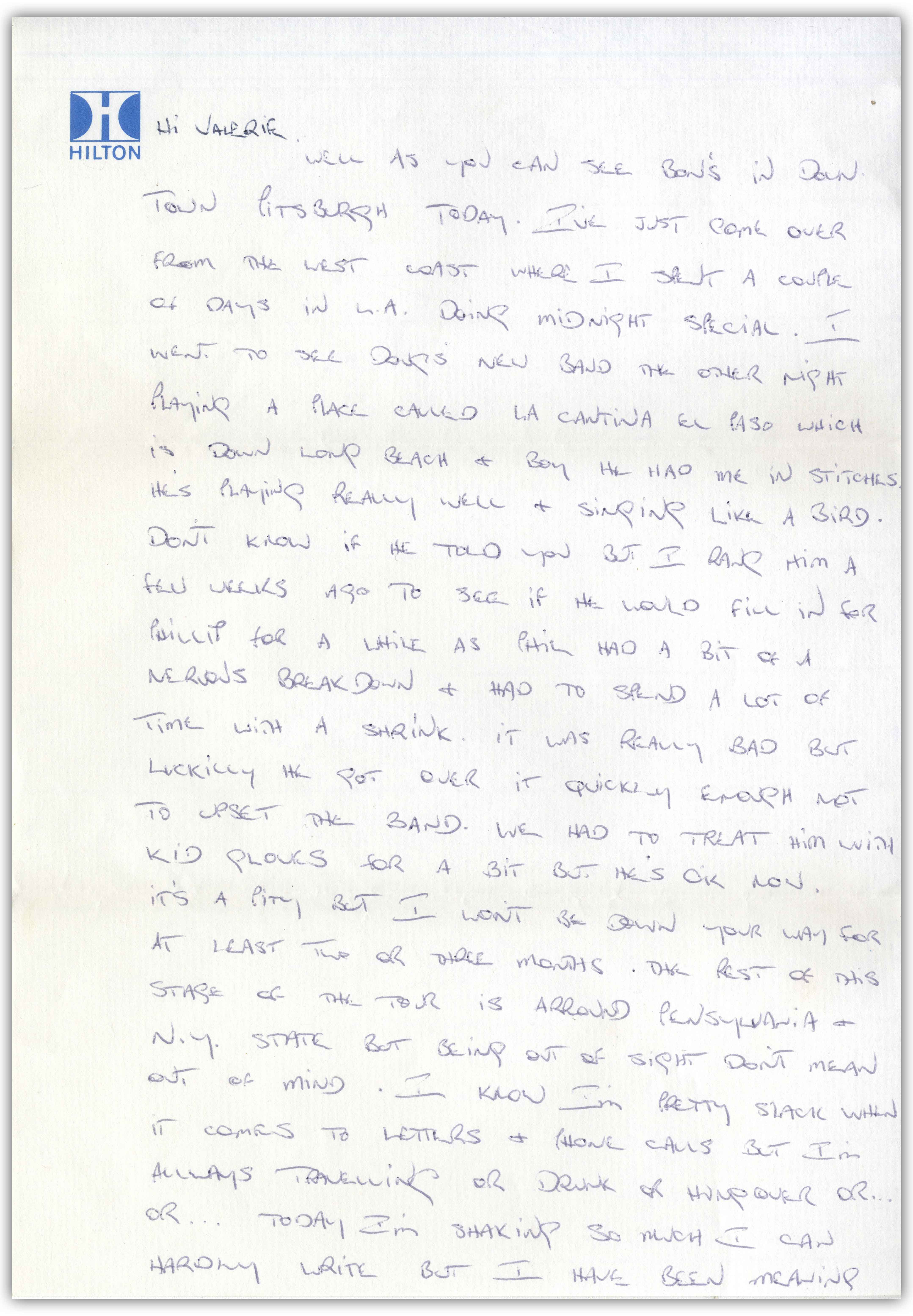 „Hi Valerie, wie du sehen kannst, ist Bon heute im Zentrum von Pittsburg. Ich gerade von der Westküste rübergekommen, wo ich ein paar Tage in L.A. verbracht und ein ‚Midnight Special‘ gemacht habe. Habe mir Dougs neue Band die eine Nacht angesehen. […] Er spielt echt gut und singt wie ein Vögelchen.