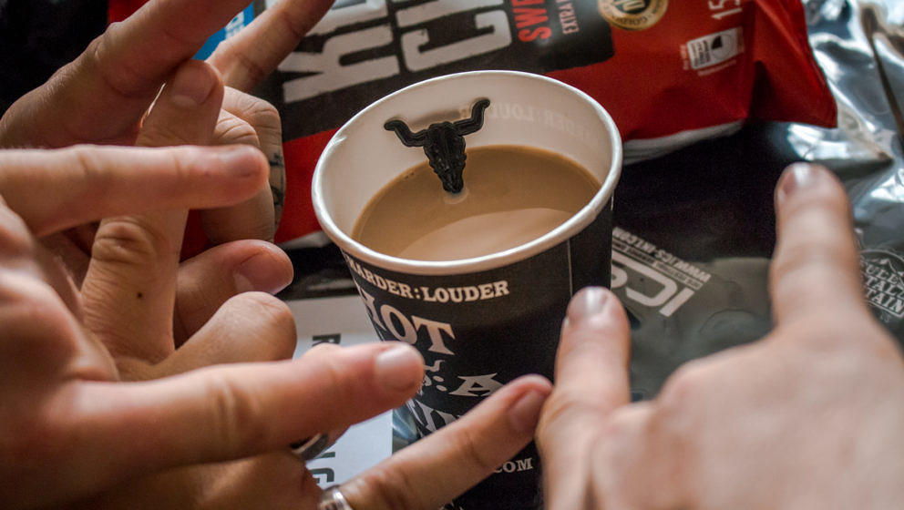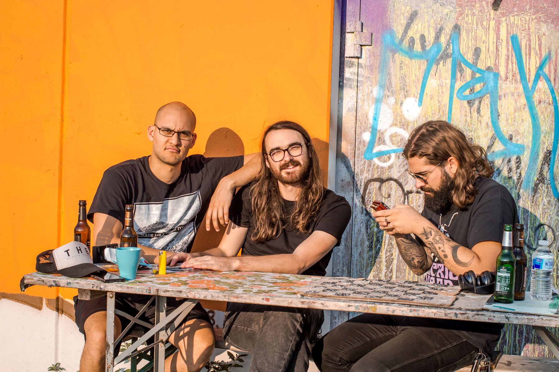 Fuck You And Die-Sänger Roman Hilser begleitet die philosophischen Gespräche mit Jackie Coke und Weißwein. Oranges Licht scheint auf den Vorplatz am Bus, besinnliches Beisammensein von alten Freunden.