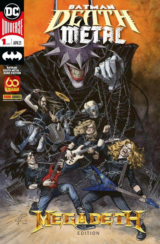 ‘Batman: Death Metal’ setzt diese Geschichte jetzt fort – und weil geheimnisvolles Metall, zerstörte Welten und mächtige Fantasy-Wesen dann eben doch ziemlich metal sind, gehen die Comic-Macher diesmal noch einen Schritt weiter: Die sieben deutschen Ausgaben erscheinen auch als Special Editions, auf deren Cover je eine Metal-Band rockt – gemeinsam mit dem diabolisch grinsenden Batman, der lacht.