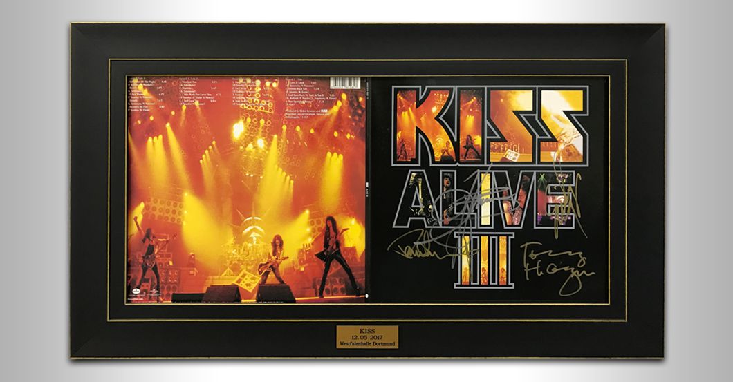 ALIVE III erschien 1993 und wird nun als ein besonderes Sammlerstück versteigert: Ein Platten-Cover von ALIVE III, das von den Band-Mitgliedern Paul Stanley, Gene Simmons, Tommy Thayer und Eric Singer beim Konzert in der Westfalenhalle Dortmund am 12. Mai 2017 handsigniert und im Anschluss daran edel gerahmt wurde. Bietet mit und lasst es euch nicht nehmen, eure Sammlung mit diesem Highlight zu bereichern!