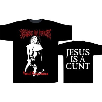 Die Frontseite des berüchtigten T-Shirts ist mit dem Bild einer masturbierenden Nonne und dem zugehörigen Spruch „Vestal Masturbation“ bereits kontrovers. Der Rückendruck Jesus Is A Cunt (die Idee entstand aus einem Brainstorming bei einer Cradle Of Filth-Probe) setzt aber noch eine Portion Provokation obendrauf: