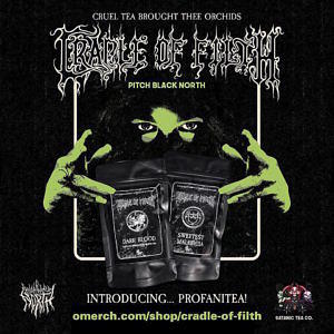 Der geeignetste Partner für solch eine dunkle Teesorte ist natürlich die „Satanic Tea Company“ Pitch Black North, die bereits seit drei Jahren mit skurrilen Teesorten handelt. Mit keckem Wortwitz werden die beiden Cradle Of Filth-Tees unter dem Banner „Cruel Tea Brought Thee Orchids“ vorgestellt. Eine Anspielung an den 1998er-CRUELTY AND THE BEAST-Track ‘Cruelty Brought Thee Orchids’. Die Sorten der Black-Metaller nennen sich passenderweise „Dark Blood“ und „Sweetest Maleficia“.