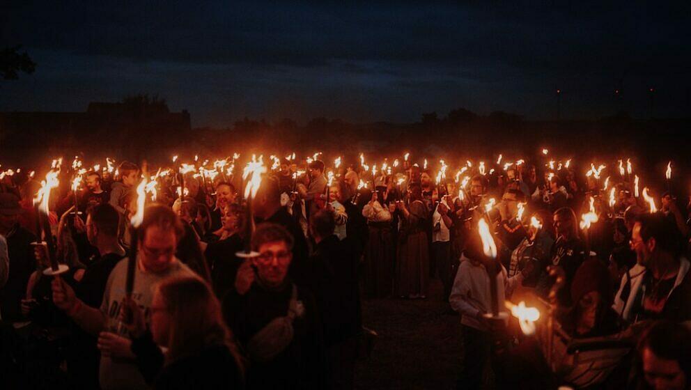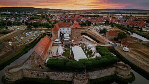 Als abschließendes Highlight des ersten Tags bekommen alle eine Fackel in die Hand gedrückt. Der Plan: Auf einer Grünfläche innerhalb der Wasserburg Heldrungen sollen die Besucher den ESO-Schriftzug nachstellen, aus der Luft fotografiert eine Drohne das Spektakel. Ein wenig Gedrängel, dann ist das Kunstwerk im Kasten. Schließlich verlangt die kollektive Müdigkeit nach Schlaf. Wie stark die Bindung der Community ist, zeigt sich in diesem Jahr ganz besonders: Danny und Celine, die sich durch das MMORPG kennengelernt haben, stellen im Stil von ‘The Elder Scrolls Online’ ihre Hochzeit nach und gaben sich vor dem Schrein von Mara noch einmal das Ja-Wort. Das Artefakt sei schon länger in Planung gewesen, sagen die Veranstalter – es brauchte nur den richtigen Anlass, um die Liebesgöttin zu würdigen.