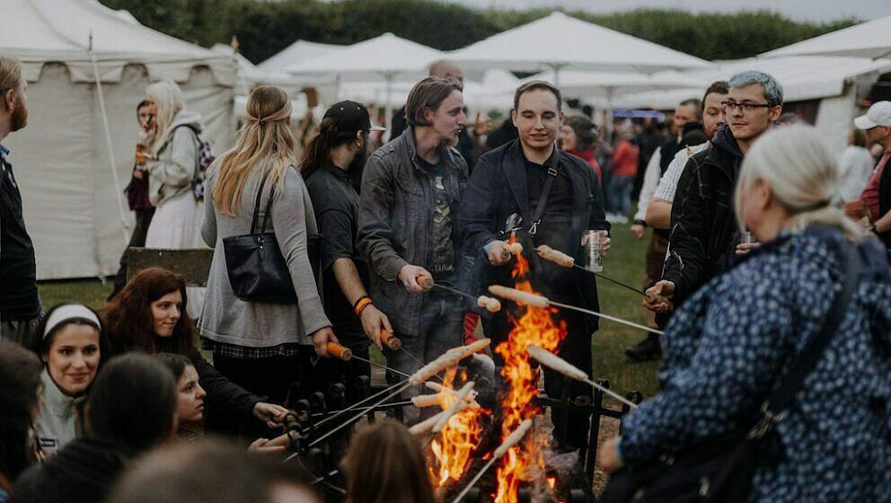 Trotz des launischen Wetters klingen in der Wasserburg Heldrungen Metbecher und Bierflaschen fröhlich aufeinander. Prasselnde Regenschauer treiben die Gäste in die Zelte. Auch im Inneren der Burg finden die Besucher angesichts reich gedeckter Tafel (leider alles nur Requisiten) Schutz. Echt ist dagegen ein riesiger Kuchen in der Form des ‘The Elder Scrolls’-Kontinents Tamriel; er zieht die Menschenmenge an – die Schlange davor ist entsprechend lang. In den späten Abendstunden wird Stockbrotteig gereicht, der über offenem Feuer gebacken wird. Eine wohlige Stärkung in der kühlen Sommernacht.