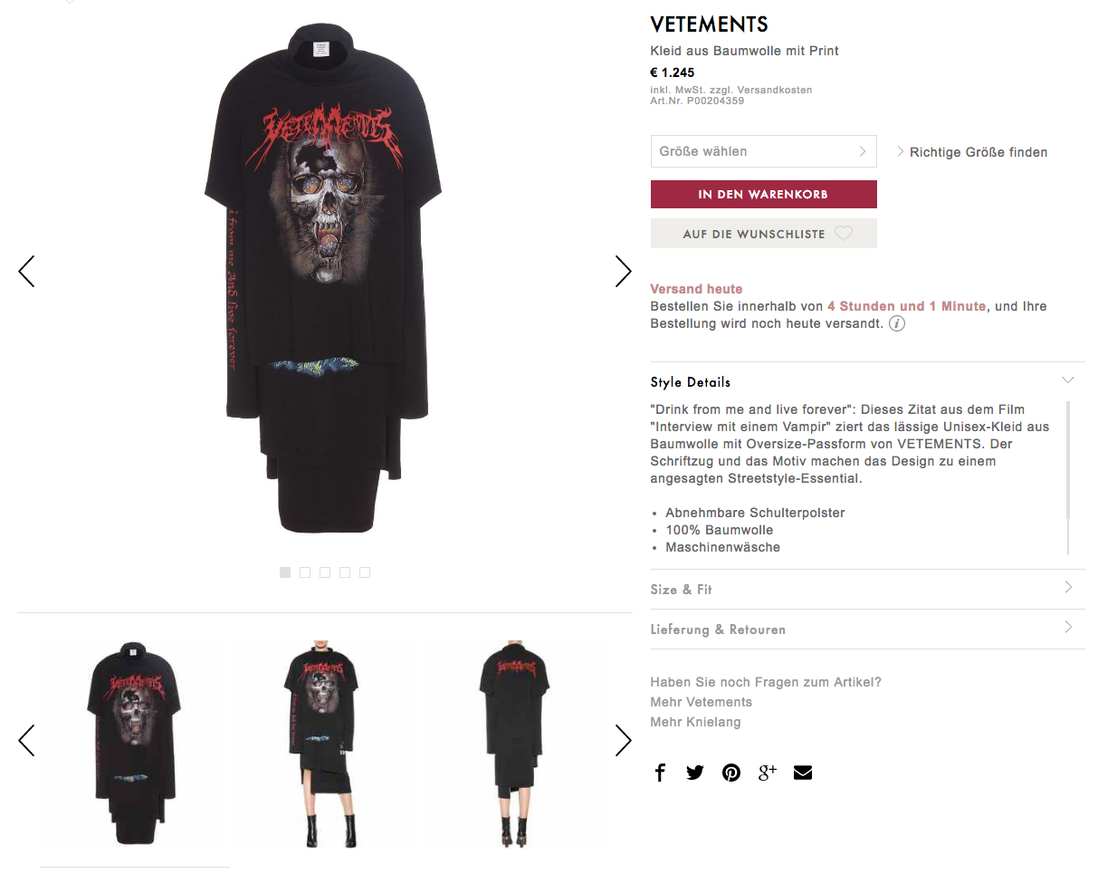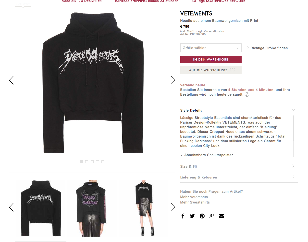 Nachdem der Bandshirt-Look bereits der „Style des Sommers“ war und uns mit Pop-Stars die den Metal-Look imitieren, wiederholten H&M-Metalshirt-Anwandlungen und teuren Designerklamotten (die dann auch noch Bandlogos klauen) genervt hat, ist der Wahnsinn jetzt auf eine neue Stufe geklettert: Das Modelabel Vetements hat jetzt einen Hoodie mit einem an Metal-Bands angelehnten Logo im Angebot, der mit lockeren 1,130 US-Dollar der teuerster “Metal”-Hoodie aller Zeiten sein dürfte. Auch in Deutschland gibt es Online-Anbieter, die die Modelinie führen – darunter Kleider mit “Metal”-Aufdruck für über 1200€ und Pullis für 780€.