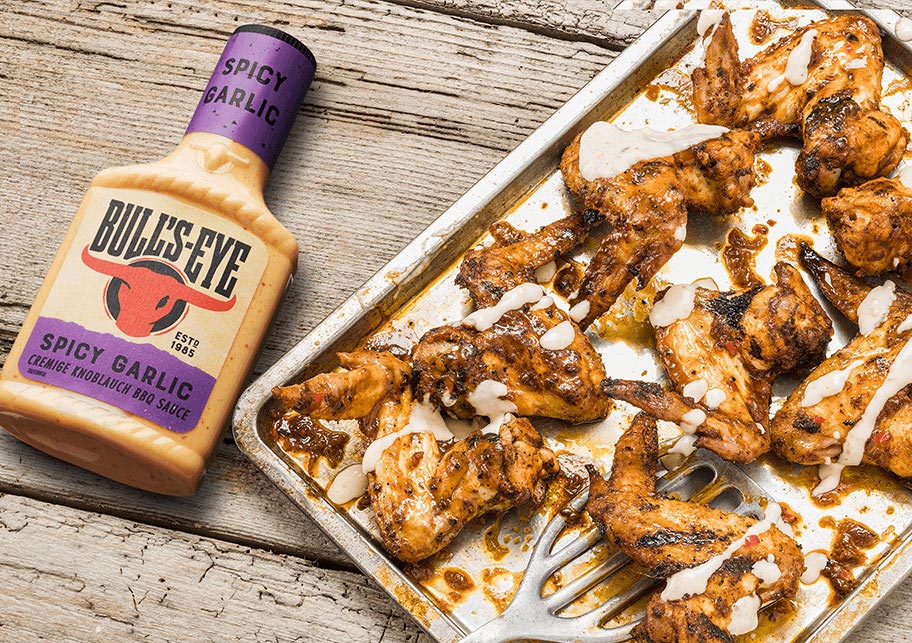 Öle deinen Grillrost ein wenig ein, bevor du die Chicken Wings darauf verteilst, so klebt das Fleisch nicht an den Stangen fest. Grille die Stücke, bis sie von außen goldig-knusprig und von innen komplett durchgegart sind. Dazu passen frisch geschnittenes Baguettebrot und die cremig-würzige Bull’s-Eye Knoblauchsauce.