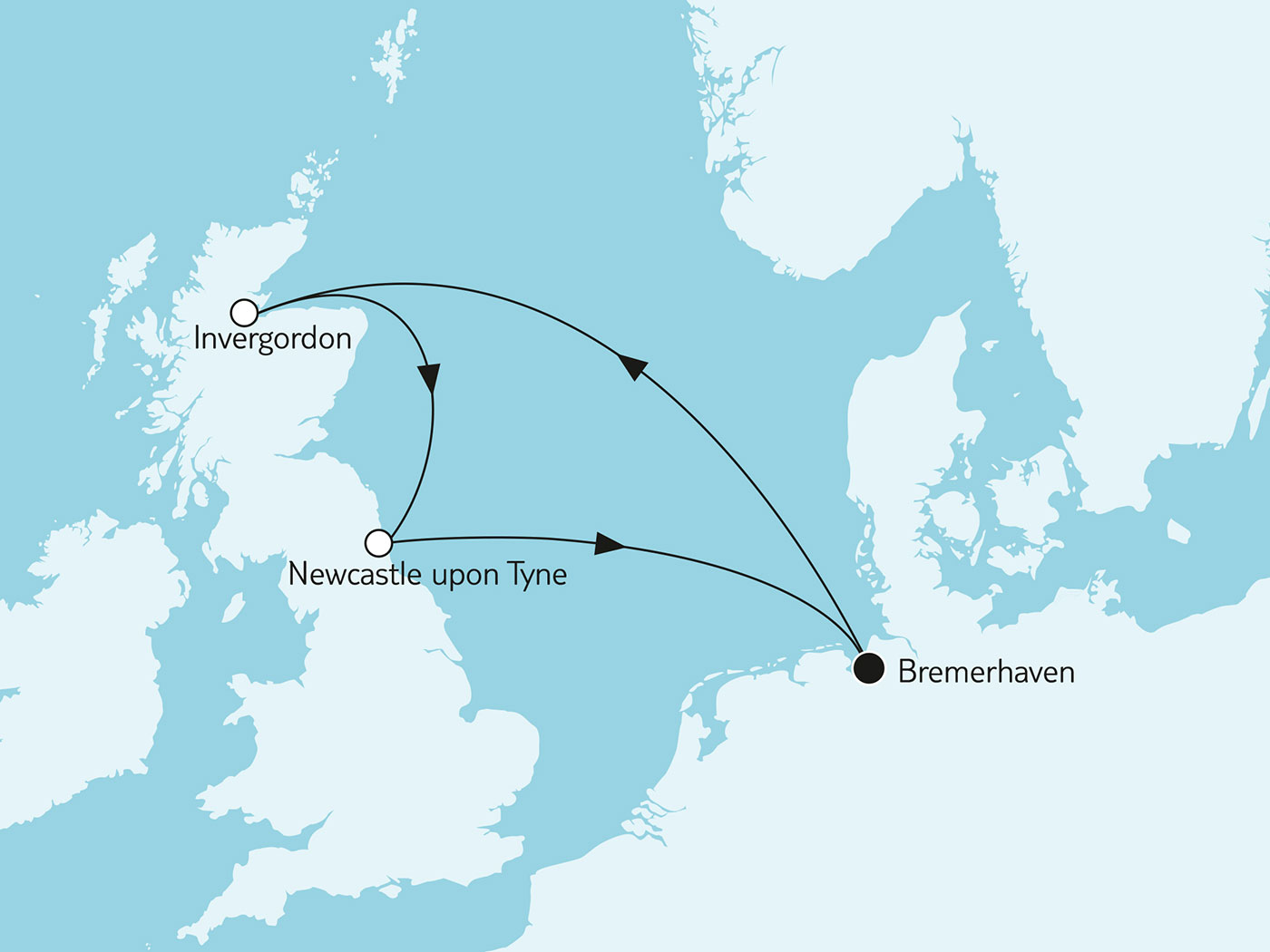 - Route: Bremerhaven – Invergordon (Schottland)– Newcastle upon Tyne (England)– Bremerhaven