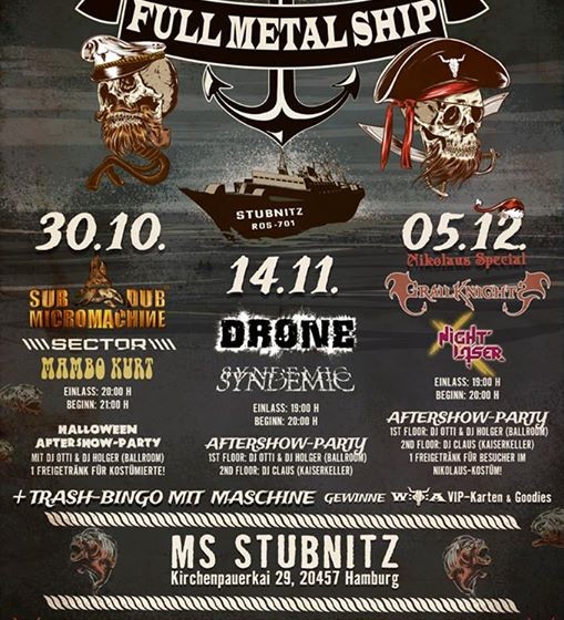 Das Warten hat ein Ende – noch in diesem Jahr erwarten Euch 3 fette Full Metal Ship Partys auf der MS Stubnitz in HH: Am 30.10. steigt unser Halloweenspecial mit SUB DUB MICROMACHINE, Sector & Mambo Kurt Am 14.11. werden Drone und Syndemic die MS Stubnitz zerrocken
