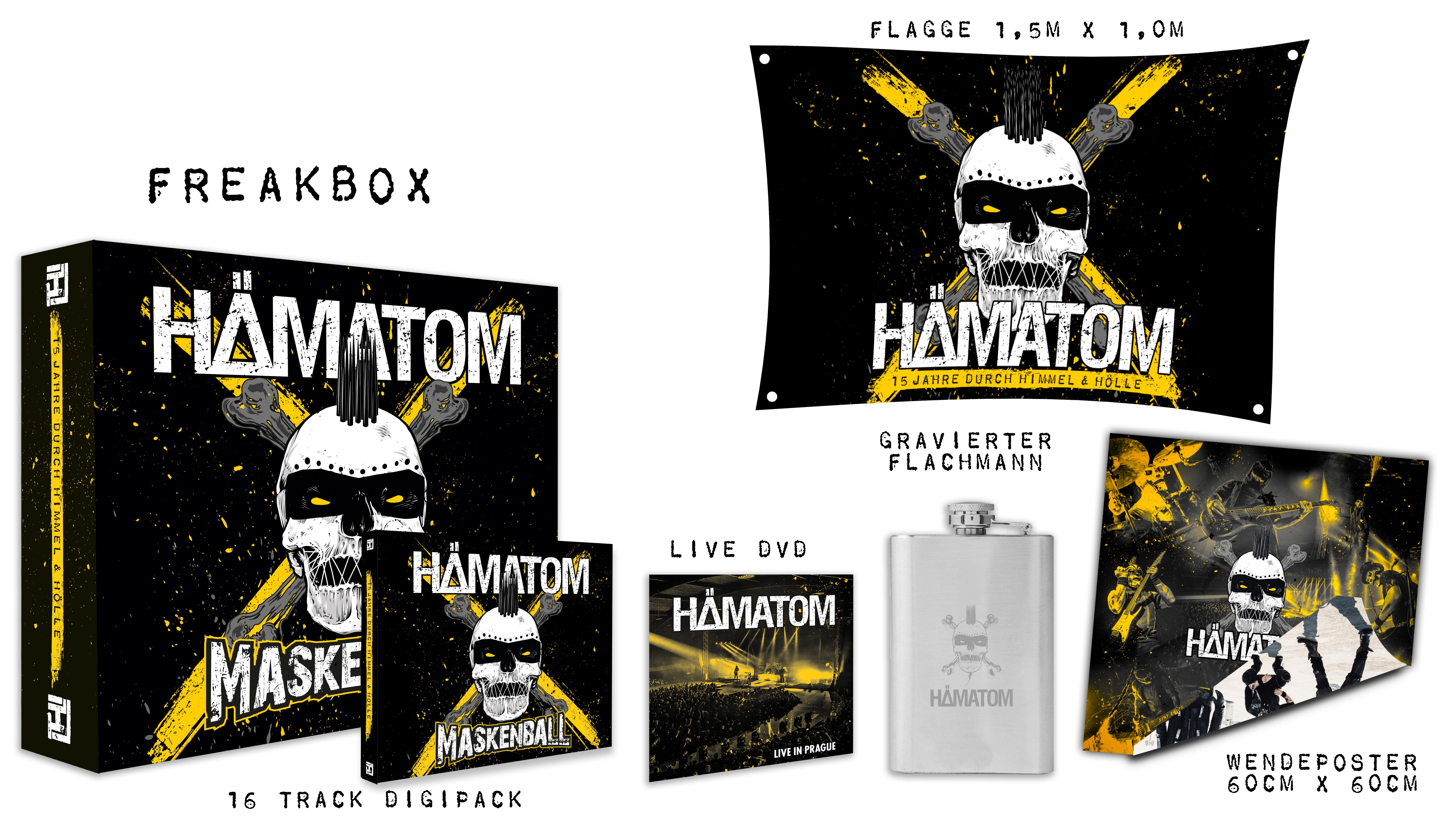 Hämatom starten mit vielversprechenden Ankündigungen in das aufregende Jahr ihres 15. Jubiläums: Pünktlich zu ihrem legendären „Maskenball“ im Amphitheater in Gelsenkirchen erscheint das gleichnamige Album am 30. August 2019. Und so schenken sie sich und ihren Fans mit MASKENBALL ein dem Anlass mehr als würdiges Album, dem sie mit einem Geburtstagskalender der herausragenden Art den Weg bereiten: Bis zum Erscheinungstermin wird es an jedem 15. der kommenden Monate eine Überraschung für die Fans geben.