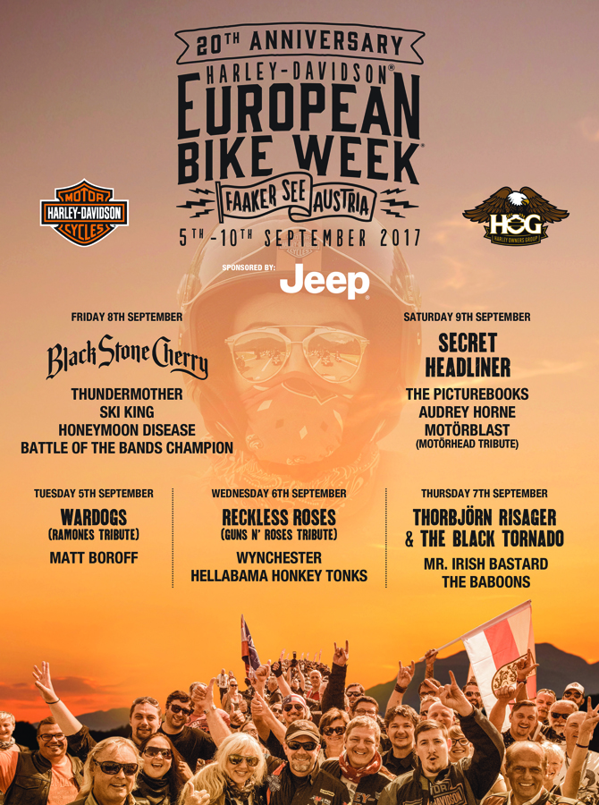 Das Line-up der Harley Davidson European Bike Week 2017 steht fest: Vom 05.09. bis 10.09.2017 findet dieses einzigartige Event am Faaker See in Österreich statt.