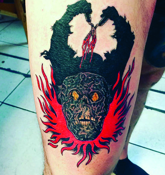 2 von 5„Ich bin riesiger Fan von Slasher-Filmen aus den Achtzigern, deswegen habe ich mir 2013 am Freitag, den 13., ein Tattoo von Jason Voorhees stechen lassen. Das hat ebenfalls Joe Kelly gemacht.”Foto: Dustin Boltjes. All rights reserved. -