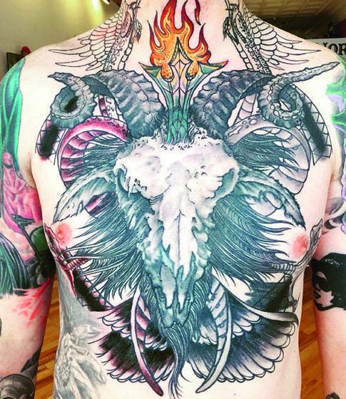3 von 5„Auf meiner Brust habe ich ein weiteres großes Stück, das noch in Arbeit ist. Es ist eine Kollaboration von zwei Künstlern: Der Baphomet-Schädel stammt von Joe Kelly, die Bereiche darum von J Brett Prince.”Foto: Dustin Boltjes. All rights reserved. -