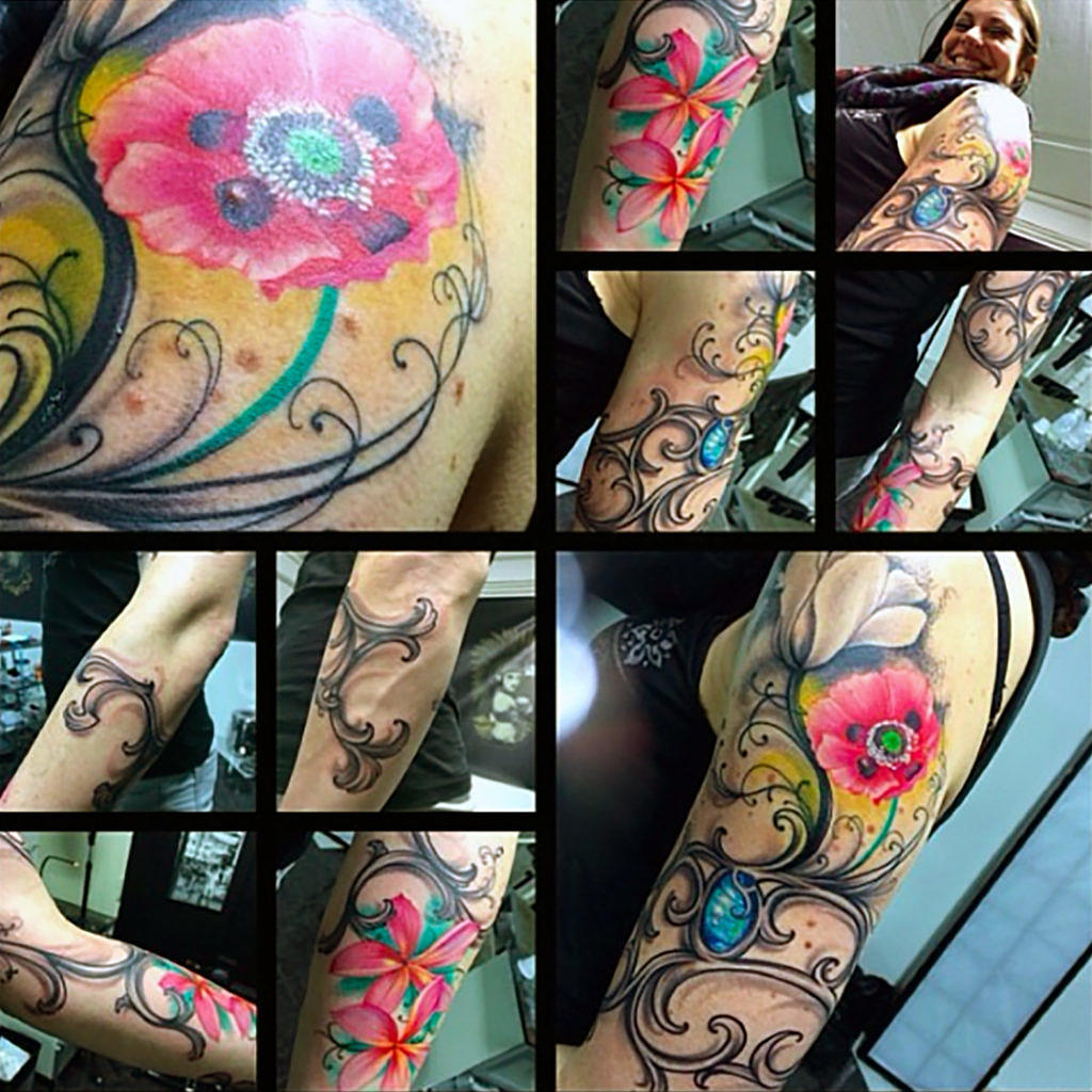 „Das ist mein erstes Tattoo, das mein Leben repräsentiert, wie es im März 2014 war. Der blaue Stein ist ein Labradorit, mein Lieblingsstein. Die beiden Blumen auf meinem Unterarm stehen für meine Familie – meine Schwester, ihren Mann und ihre Kinder sowie meine Eltern. Dieses Tattoo wird im Lauf meines Lebens immer größer, 2019 wurde es aktualisiert. Gestochen wurde es von Silvia im Artfaktors in Essen.“