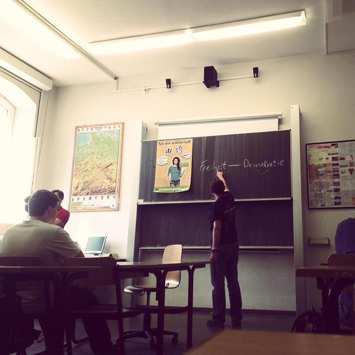 Als Mitglied der politischen Metalcore-Band und promovierter Verfassungsrechtler konnte Maik Weichert den Schülern während seiner zweistündigen Vertretung einiges zu Themen wie Freiheit und Demokratie erzählen. Noch bis zum 17.09.2013 besuchen Musiker sächsische Schulen, darunter zum Beispiel auch Hagen Stoll und Sven Gillert von Haudegen.