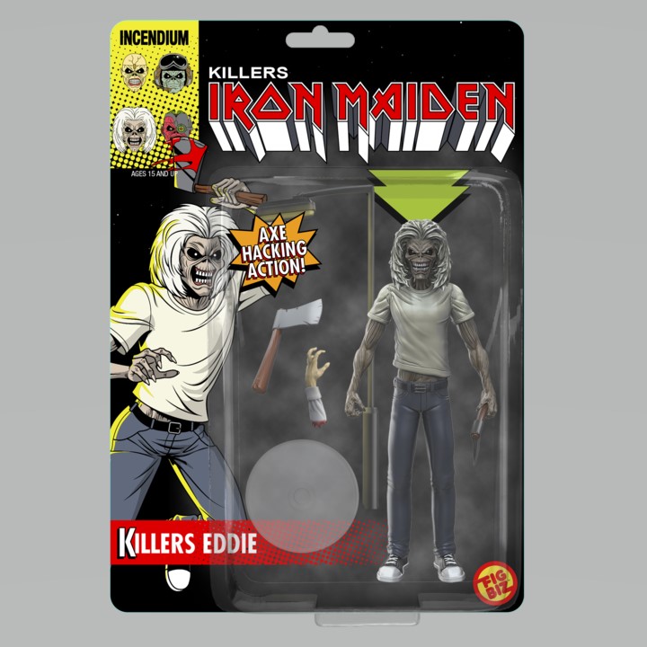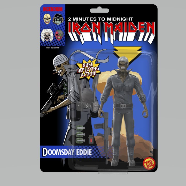 Die Iron Maiden-Figuren sind jeweils 5 Zoll beziehungsweise 12,7 Zentimeter groß. Bei einem Männchen handelt es sich um einen Trooper-Eddie in ikonischer britischer Kavallerie-Uniform, der mit Flagge, Schwert, abnehmbaren Rucksack und Standfuß kommt. Dem vom KILLERS-Album inspirierten Eddie liegt eine kleine Axt bei. Für den Doomsday-Eddie mit seinem Maschinengewehr lieferte der Hit ‘2 Minutes To Midnight’ die Vorlage. Und der Cyborg-Eddie mit seinen zwei Laser-Pistolen und dem Schienengewehr als Beilage ist logischerweise direkt aus dem SOMEWHERE IN TIME-Artwork heraus gesprungen.
