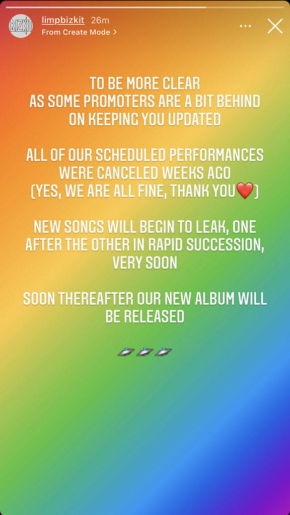Nachdem Limp Bizkit kürzlich alle gebuchten Konzerte wegen Corona-Bedenken abgesagt haben, posteten sie ein Statement. „Um es noch einmal klarzustellen, da manche Veranstalter etwas hinterherhinken, wenn es darum geht, euch auf dem Laufenden zu halten. Alle unseren geplanten Shows wurden vor Wochen abgesagt. (Ja, uns allen geht es gut, danke.) Neue Songs werden sehr bald in schneller Abfolge geleakt, einer nach dem anderen. Bald danach wird unser neues Album veröffentlicht werden.“ Ob das kommende Werk dann immer noch STAMPEDE OF THE DISCO ELEPHANTS heißt, ist unklar.
