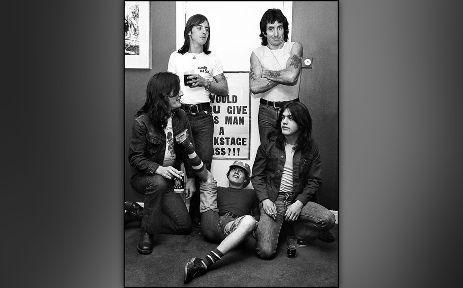 2 von 191977. (L-R:) Phillip Rudd,Angus Young, Mark Evans, Malcolm Young und Bon Scott.Foto: Hulton Archive/Getty Images. All rights reserved. -