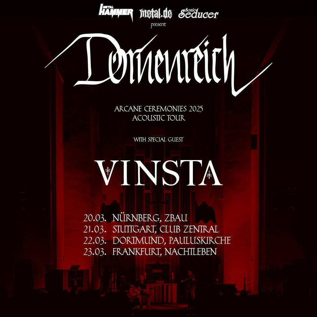 Nach einer fast vollständig ausverkauften und allerorts gefeierten Tour 2024 werden Dornenreich ihre ARCANE CEREMONIES-Reihe im Jahr 2025 mit einigen ausgewählten Konzerten komplettieren. Begleitet werden sie hierbei von Vinsta.