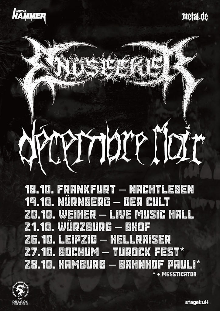 Endseeker werden im Oktober sieben Live-Termine in Deutschland absolvieren. Die Termine der Doppel-Headliner-Tournee mit Décembre Noir findet ihr weiter unten. „Wir haben gerade mit den Aufnahmen für unser nächstes Album begonnen. Gleichzeitig sind wir begeistert, bald zusammen mit unseren Freunden Décembre Noir auf Tour zu sein. Sie werden ebenfalls im späteren Verlauf des Jahres eine neue Platte rausbringen.