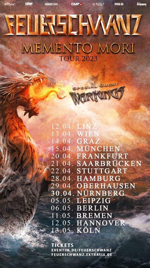 Ein solch außergewöhnliches Album muss natürlich auch live präsentiert werden. 2023 kommen Feuerschwanz deswegen endlich wieder auf eine ausgedehnte Tournee, um Memento Mori auf ihre unverwechselbare Art ausführlich live zu zelebrieren – nicht verpassen! Mit dabei als Special Guest: Warkings.
