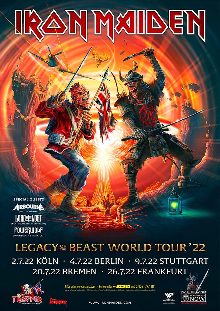 [Update vom 14.10.2020] Die Iron Maiden-Konzerte, die im Rahmen der Legacy Of The Beast-Tournee nächstes Jahr stattfinden werden, eröffnen hierzulande Airbourne und Lord Of The Lost. Eine Ausnahme bildet die Show am 13. Juni in der Bürgerweide in Bremen. Dort werden Lord Of The Lost nicht mit dabei sein. Stattdessen wurde für diesen Termin nun aber ein neuer Special Guest bekanntgegeben. Die Show wird von Powerwolf miteröffnet.