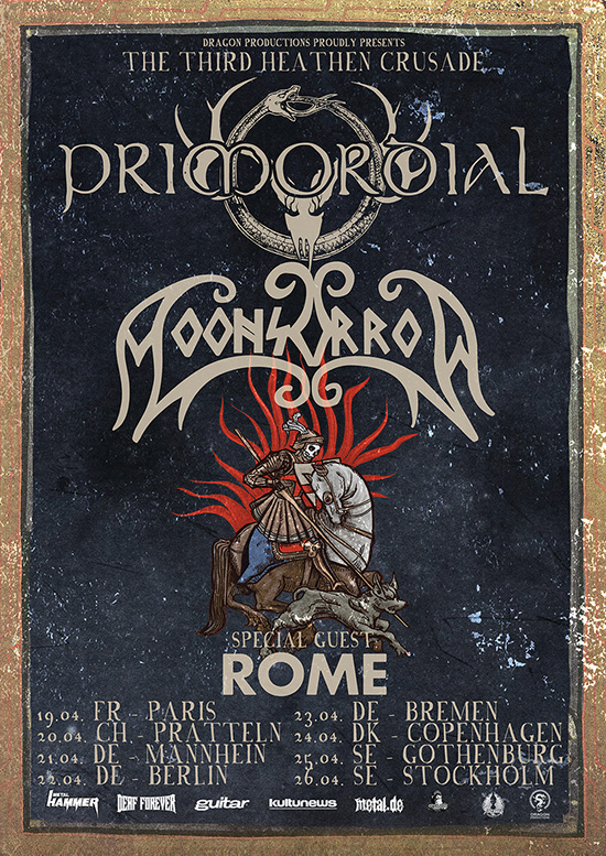 Primordial–Sänger A.A. Nemtheanga kommentiert das Ganze wie folgt: „Mit großer Freude können wir zusammen mit unseren Brüdern von Moonsorrow ein weiteres Kapitel der ‚Heathen Crusade‘ ankündigen. Einige verschiedene Städte und Länder, in welche wir die Crusade noch nie gebracht haben! Wir werden eine Reihe wilder Songs aus unserem reichhaltigen Katalog spielen, auch selten Gehörtes und Obskures! Mit uns im Bus ist das musikalisch Neofolk-Phänomen Rome, etwas Einzigartiges und Andersartiges.„