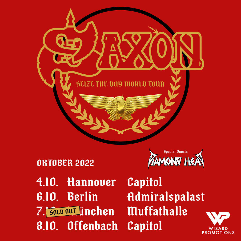 Die Legende kommt mit immenser Kraft und vollem Gebrüll… Saxon haben am 4. Februar ihr neues Album CARPE DIEM via Silver Lining Music veröffentlicht und kündigen die „Seize The Day“-Welttournee an. Im Rahmen ihrer Deutschlandkonzerte spielt die Band im Oktober 2022 in vier Städten, wobei Diamond Head als Special Guest auftreten werden. CARPE DIEM ist das inzwischen 23. Album der ikonischen britischen Heavy Metal-Band und erreichte Platz 3 der deutschen Album-Charts. Frontmann Biff Byford kommentiert: „Wir können es kaum erwarten, wieder auf eine richtige Tour zu gehen, das wird monumental! Ich sehe euch alle da draußen… SEIZE THE DAY!