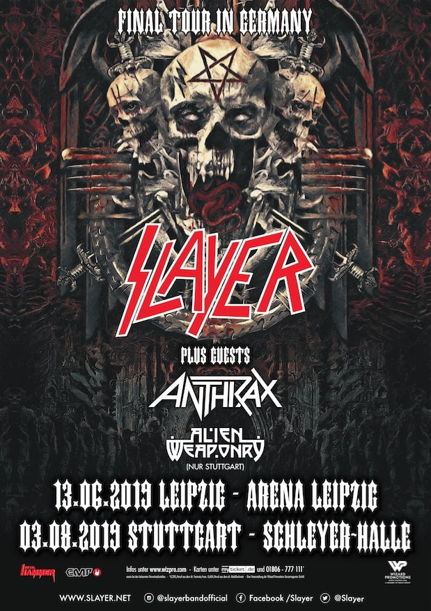Ende August 2018 kündigten die Thrash-Titanen zudem an, dass sich die Abschiedstournee bis 2019 verlängern wird. Wegen großer Nachfrage wurden wurden auch zwei Zusatztermine offiziell bestätigt: Fans in und um Leipzig und Balingen können sich auf weitere Slayer-Shows in Deutschland freuen!