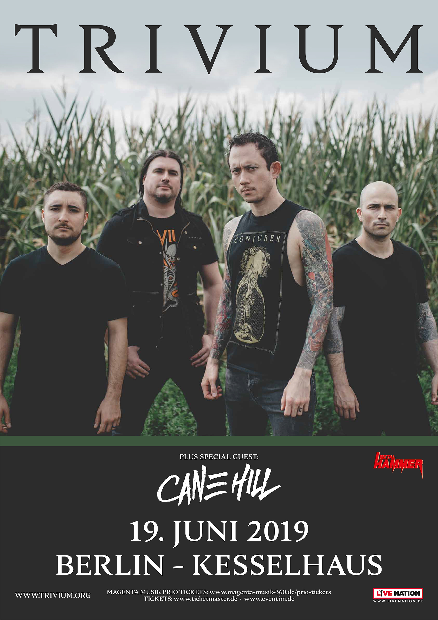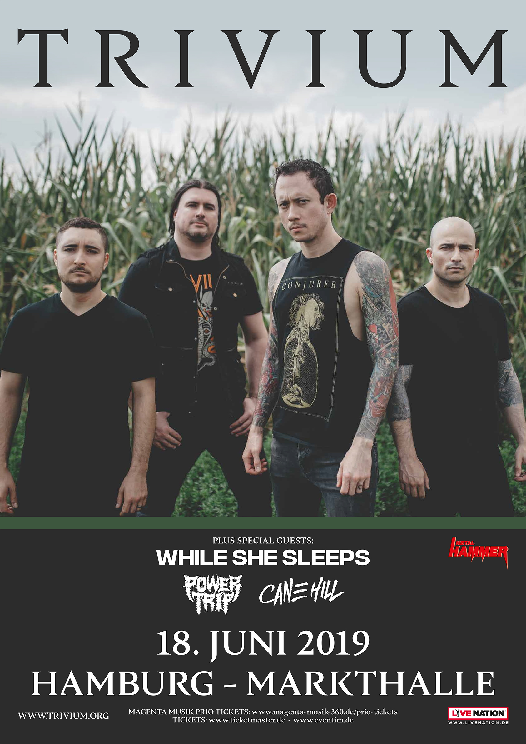Die Urgewalt der US-amerikanischen Thrash Metal-Heroen Trivium ist legendär. Ihre intensiven Konzerte zählen zu den besten des Genres, ihre kommerziellen Erfolge wachsen seit einem Jahrzehnt stetig. Trivium präsentieren dem Publikum unter anderem ihr achtes Album THE SIN AND THE SENTENCE live. Special Guests für beide Shows sind Cane Hill und in Hamburg zusätzlich While She Sleeps und Power Trip.