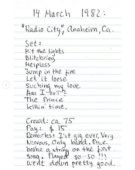 Ulrich postete ein Bild, das ihn an seinem ersten Camco Kit zeigt (allerdings nicht vom ersten Gig, von dem keinerlei Fotos existieren), den Flyer, die von ihm handgeschriebene Setlist sowie persönliche Aufzeichnungen aus seinem Tagebuch.