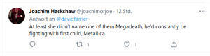 Der neuseeeländische Journalist und Dokumentarfilmer David Farrier (unter anderem ‘Dark Tourist’ bei Netflix) berichtet auf seinem Twitter-Account von einer ganz speziellen Dame. Er sei stolz berichten zu können, dass eine Frau in Neuseeland ihre drei Kinder Metallica, Slayer und Pantera genannt hat. „Sie sagte mir, es sei nicht leicht, drei der härtesten Bands aufzuziehen.“