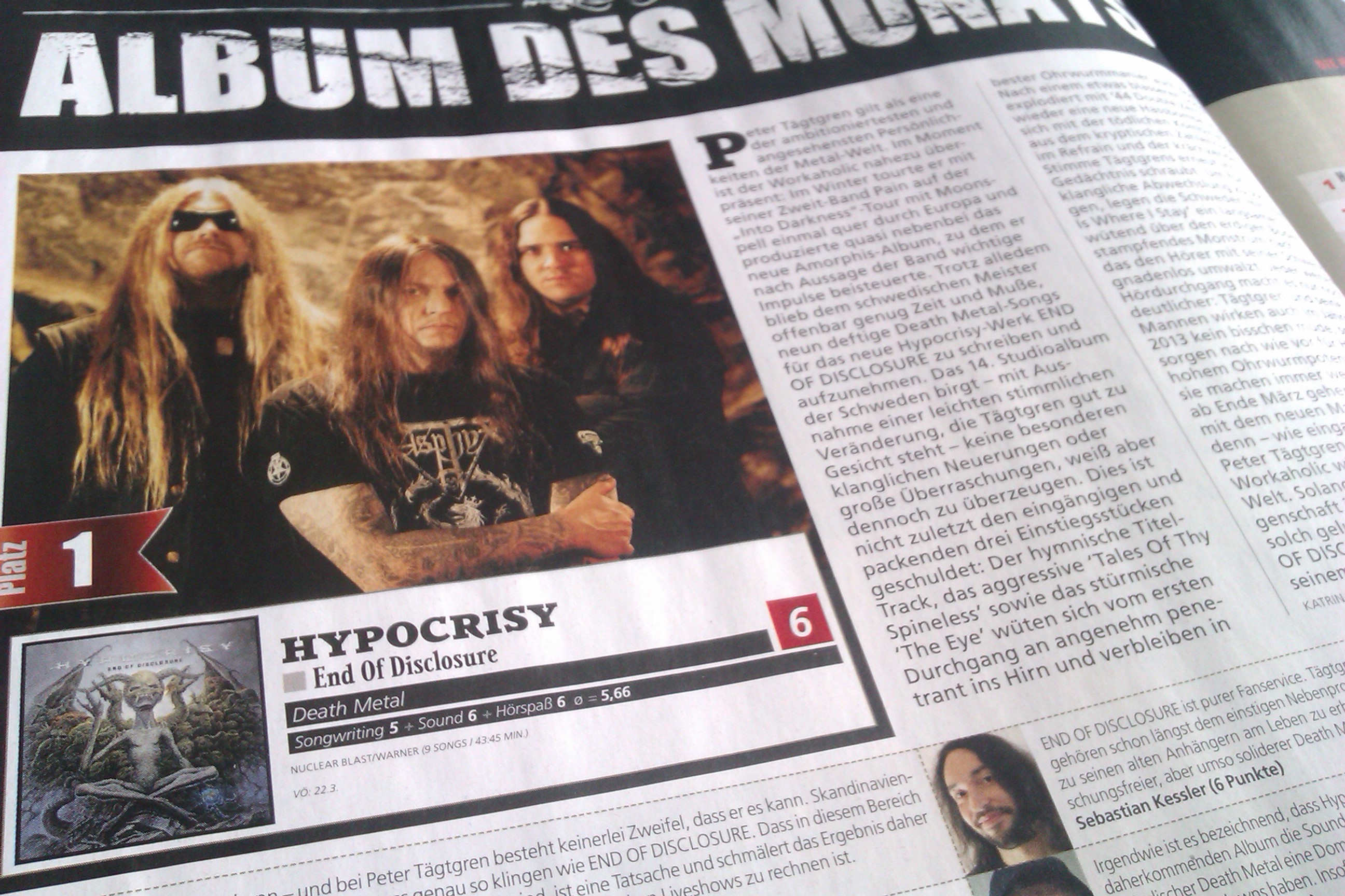 1 von 8END OF DISCLOSURE von Hypocrisy ist das Album des Monats in unserer April-Ausgabe. Was die einzelnen Redakteure von dem Album halten, lest ihr hier... -