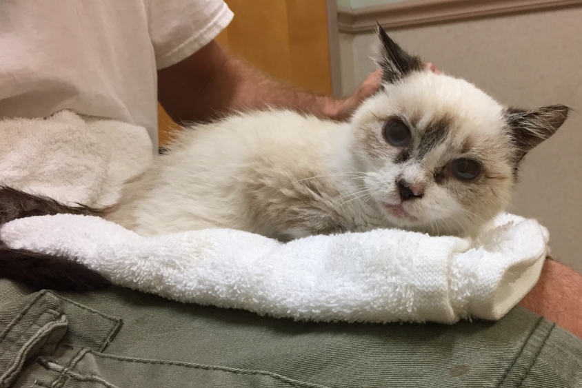 Tardy jedoch brachte es nicht über Herz, „dieses arme, kleine, acht Wochen alte Baby angesichts des bevorstehenden Sturms allein draußen zu lassen und saß zwei Stunden vor dem Zaun, unter dem das Kätzchen sich verkrochen hatte.“ Als Tardy gegen zwei Uhr erfolglos ins Bett ging, wusste er, dass er am nächsten Morgen noch mal versuchen wollte, dem Tier zu helfen.Also ging er, nur kurze Zeit bevor „Irma“ ankam, noch mal mit seinem Netz nach draußen und suchte die Büsche ab – die Katze bemerkte ihn allerdings und flüchtete schnell. „Ich sah sofort, dass mit ihr etwas nicht stimmte: Sie humpelte, ihre Hinterbeine schienen nicht richtig zu funktionieren. Da war mir klar, dass ich ihr auf jeden Fall helfen musste.“