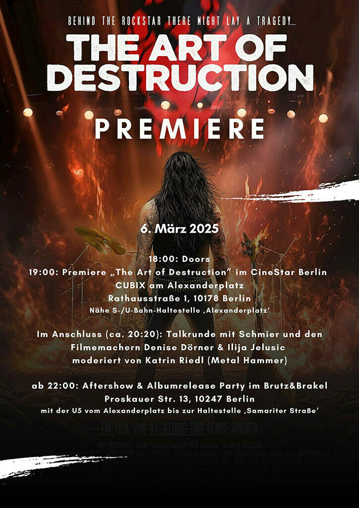 Die Weltpremiere von ‘The Art Of Destruction’ findet am 6. März 2025 im Premierenkino CineStar – CUBIX am Alexanderplatz, Berlin statt. Tickets könnt ihr hier erwerben.