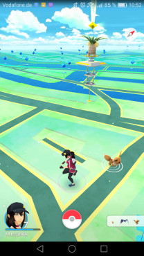 Ihr steht mit eurem Trainer auf einer stilisierten Weltkarte, die die Straßenzüge in Ihrer Umgebung anzeigt. Wenn ihr euren Charakter bewegen wollen, müssen ihr euch auch in der Realität bewegen – „Pokémon GO“ sorgt also für ordentlich sportliche Betätigung. Mit den Fingern zoomt ihr heran oder heraus, um einen besseren Überblick zu bekommen.