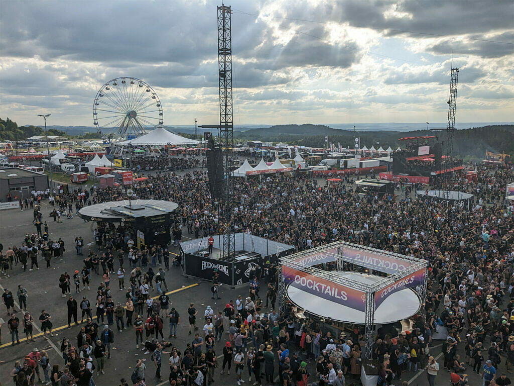 So stark das Festival am Freitag mit Asinhell, Kerry King und Kreator begann, fällt der Samstag ein wenig unter das Motto „metallicus interruptus“, was aber auch Gelegenheit bietet, das Gelände genauer zu erkunden. Merch und Nippes, eine sehr große Auswahl an Speisen und Getränken, das Riesenrad und die grundsätzlich gute Organisation lassen schnell vergessen, dass sich hier rund 90.000 Menschen tummeln, um Spaß zu haben. Auch das Wetter spielt mit, denn es bleibt trocken, und selbst der Wind schafft es nicht, den Tontechnikern ins Handwerk zu pfuschen.