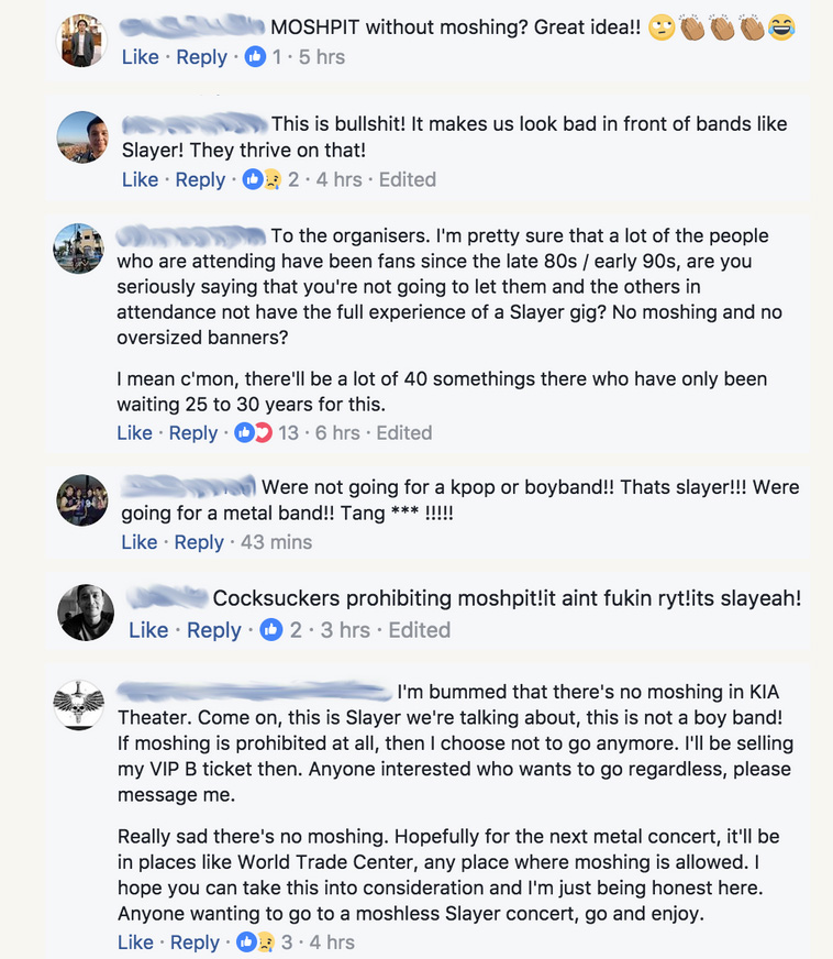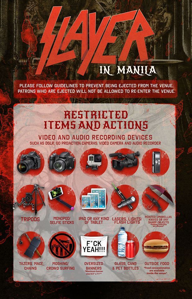 Die Slayer-Fans auf den Philippinen waren absolut begeistert, ihre Helden Slayer am 11. Oktober 2017 erstmals in Manila live erleben zu können. Doch diese Begeisterung hielt nicht lange: Am Tag vor dem Konzert veröffentlichten die Tourpromoter eine Grafik mit Dingen, die bei diesem Konzert verboten sind.