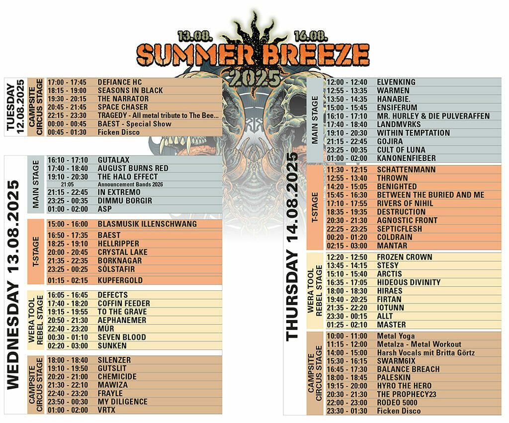Das Summer Breeze ist erneut ausverkauft! Und das zum ersten Mal in der Festival-Geschichte bereits am 01. Dezember. „Wir sind sprachlos und unendlich dankbar, dass ihr, die Fans, uns so zahlreich und so früh euer Vertrauen schenkt. Die Vorfreude auf ein wunderbares SUMMER BREEZE 2026 ist schon jetzt riesig! Ab sofort sind sind keinerlei Festivaltickets inklusive Camping und Zugang an allen Festivaltagen mehr verfügbar. Tagestickets werden in limitierter Stückzahl in Kürze erhältlich sein.“
