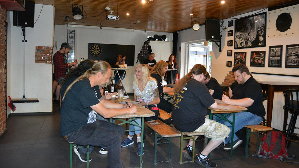 Es gibt Bier, Ebbelwoi und Hausmannskost nebst einem Gespräch mit Bassist Frank über den Umstand, dass heute nicht mehr alles schlecht ist, was im Supermarkt als Fleischalternative verkauft wird. Der Mann muss es wissen, hat er doch als indoktrinationsresistenter Jungspund regelmäßig bei den Hare-Krishna-Mönchen gespeist, wo man für einen kleinen Taler einen leckeren, fleischlosen Snack bekam. Der Taschengeldzweck heiligt eben die Mittel.