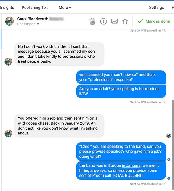 „Warum! Warum! Warum!“, schreibt Carol, „ihr seid nichts außer dreckig.“ Und weiter: „Ihr dreckigen Mistkerle solltet euch schämen. Ihr wisst, die sozialen Medien können so hilfreich dabei sein, den Ruhm von jemanden zu ruinieren.“ In den mittlerweile wieder vom Band-Account entfernten Screenshots sieht man, dass Carol ein paar besonders lustige Rechtschreibböcke geschossen hat. Statt „scumbags“ schreibt sie zum Beispiel „cum bags“, und statt „motherfuckers“ tippt sie „mother fuchers“.