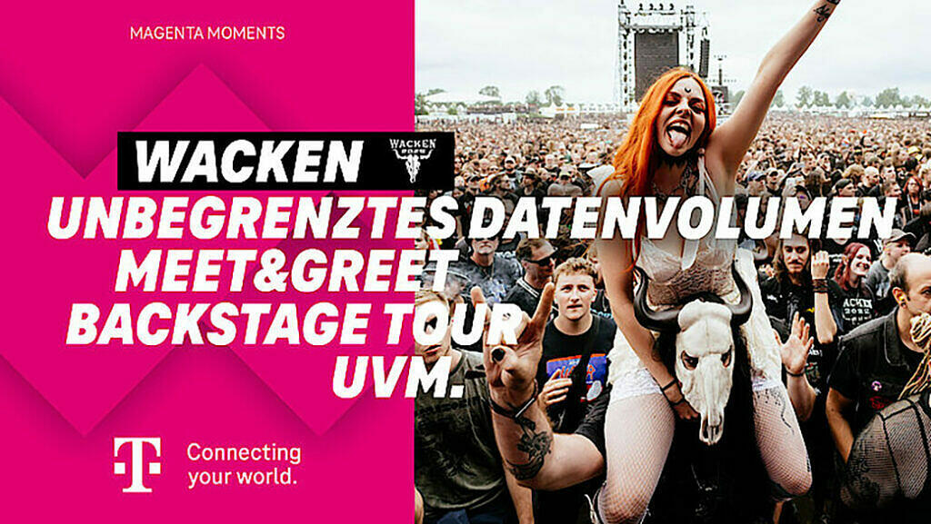 Nur in der MeinMagenta App und nur solange der Vorrat reicht – mit Magenta Moments haben Telekom-Kunden beim Wacken Open Air die Chance auf ganz besondere Momente. So sind Meet & Greets und Backstage-Touren zu gewinnen, bei denen man mit den Stars auf Tuchfühlung gehen und einen exklusiven Blick hinter die Kulissen erhaschen kann. Besonderes Highlights sind ein Meet & Greet mit Wacken-Gründer Holger Hübner sowie eine Song-Recording-Session mit der Band Beyond The Black. Außerdem werden zwei signierte Wacken Open Air-Gitarren und Wacken United-Tickets verlost. Und nicht zuletzt können alle Telekom Kunden unbegrenztes Datenvolumen freischalten, mit dem sie jeden Moment teilen können.Bestes Netz für beste Festival-Stimmung