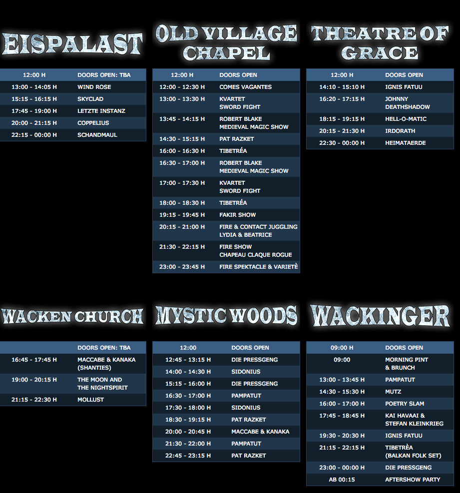 Die Folk-Rocker Schandmaul sind mit dabei, Grave Digger, Elvellon, Ingrimm, Coppelius, Skyclad, Letzte Instanz, Krayenzeit, Torfrock, Mr. Hurley & die Pulveraffen, Elvenking, Corvus Corax und weitere. Frisch bestätigt sind Orphaned Land, Visions Of Atlantis, Die Pressgëng, Heimataerde und Hell-O-Matic.
