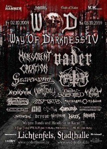 Stattfinden wird das Way Of Darkness Festival am 02./03. Oktober 2009 in der Stadthalle Lichtenfels. Momentan gibt es dazu auch einen Frühbucher-Rabatt, dessen Kontingent aber schon zu 75% ausverkauft ist. Wer sparen will, sollte sich also beeilen.