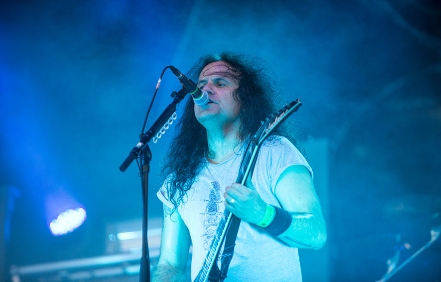 Ähnlich engagiert, aber gegen die brutalen Bedingungen gleichermaßen machtlos sind im Anschluss die Death-Trasher von Sylosis, die den Wenigen, die im spärlichen Schatten der Hauptbühne Zuflucht gefunden haben dennoch trotzig und unbeeindruckt ihre geschliffenen Song-Geschosse um die Ohren hauen. Wer es vor der Bühne erträgt, versucht die Anstrengung der Band mit angemessenem Körpereinsatz wertzuschätzen.