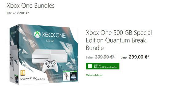 Microsoft hat den Preis von zahlreichen Xbox One-Bundles drastisch gesenkt. Die meisten 500 GB-Varianten der Konsole kosten ab sofort 299€, die 1 TB-Versionen ungefähr 329€. Die Angebote sollen zunächst nur bis kurz vor Start der Electronic Entertainment Expo in Los Angeles am 14. Juni gelten – viele Beobachter spekulieren über eine Ankündigung einer stärkeren Xbox-Variante für VR-Anwendungen sowie eine neue Slim-Variante der alten Xbox One.